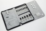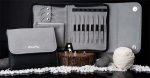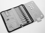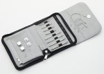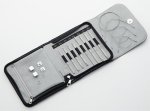 2" Mini Set includes - 8 sets of 2” Stainless Steel Interchangeable Needle tips US size 2.5, 4, 5, 6, 7, 8, 9 & 10; 4 Nylon coated Stainless Steel Cables with silver connectors to make lengths of 10.8” & 12”, 4 end caps, & 2 cable keys, 1 Finishing needle, 10 Locking Stitch Markers & 10 Round Stitch Markers, in a Black and Grey fabric case.